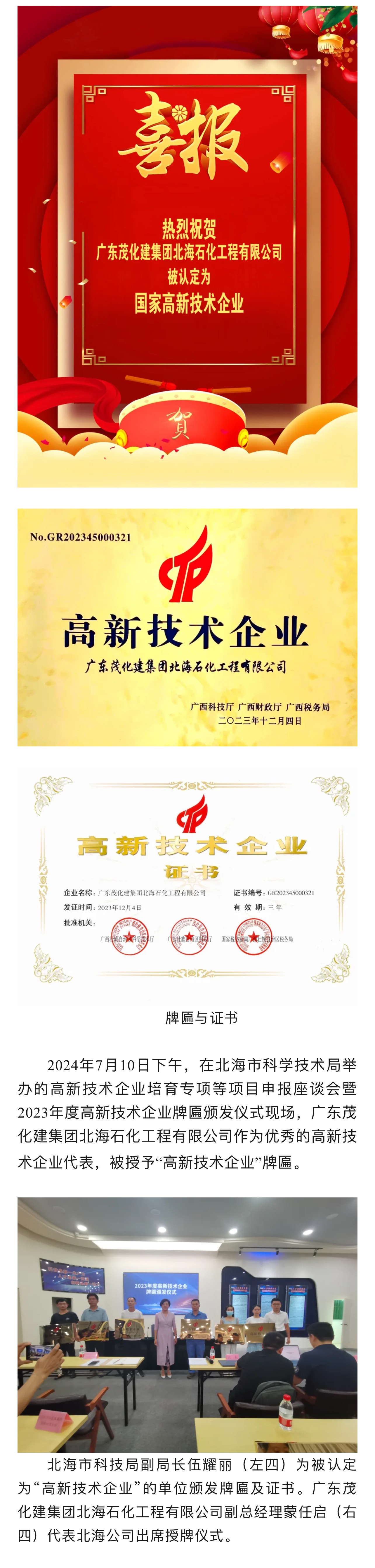 喜報(bào)|廣東茂化建集團(tuán)北海石化工程有限公司 躋身“國家高新技術(shù)企業(yè)”行列