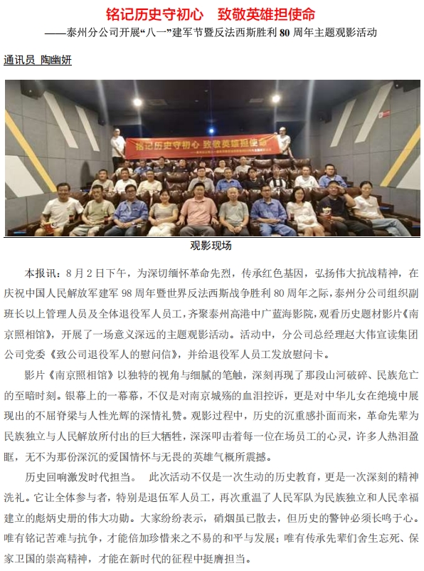 泰州分公司開(kāi)展“八一”建軍節(jié)暨反法西斯勝利80周年主題觀(guān)影活動(dòng)